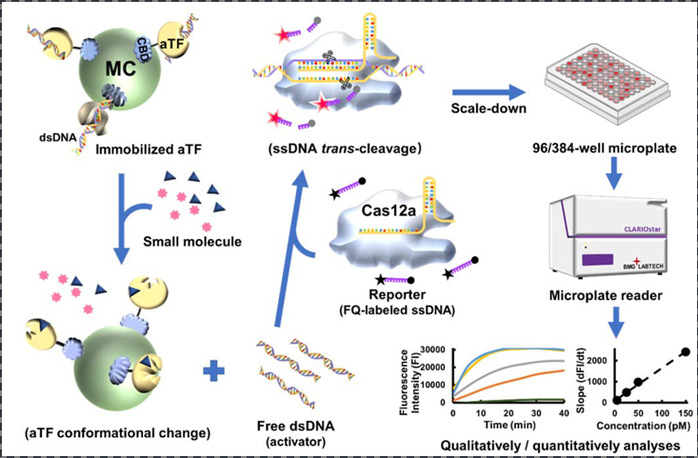如图所示,CaT-Smelor利用蛋白质固定化技术,将具有DNA结合活性的aTF固定在微晶纤维素颗粒上。当目标小分子出现时,aTF会因小分子诱导而发生构象改变进而降低其与DNA的结合活性,使DNA从aTF上游离出来。通过序列设计,游离的DNA分子可以激活CRISPR/Cas12a的反式切割活性,导致单链荧光探针被切割而产生荧光。最后,通过检测和分析荧光信号就可以实现目标小分子的检测。研究发现,CaT-Smelor可在微孔板中实现对微量血液、发酵液等样品中的目标小分子(例如尿酸、对羟基苯甲酸、四环素)的快速定性和定量检测,检测灵敏度均达到纳摩尔水平。该方法不仅成本低廉,相对传统检测技术也有明显的优势。后续在疾病诊断、代谢物检测以及便携式检测设备开发中具有极大的应用潜力。