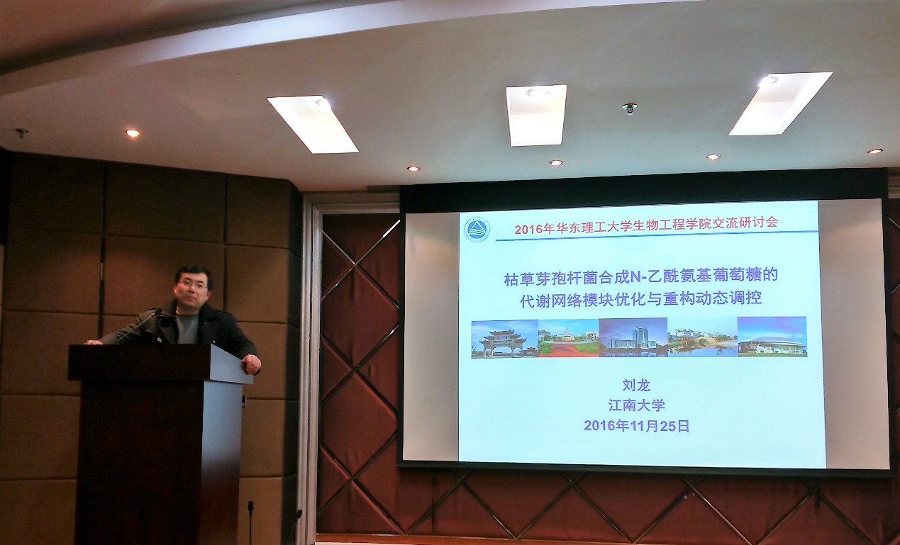 刘龙教授以枯草芽孢杆菌合成N-乙酰氨基葡萄糖为例,讲述了通过代谢网络模块化和重构调控成功地将N-乙酰氨基葡萄糖的产量从0到提升到100 g/L以上的精彩案例,实现了代谢网络调控机制指导下的理性设计。