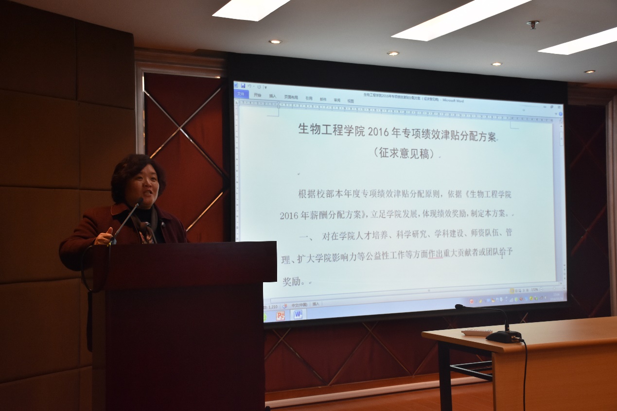 2016年专项绩效津贴分配方案》(征求意见稿)(以下简称《专项津贴分配方案》)。30多位代表到场,工会主席蔡海波主持会议,学院党委书记陆兵、院长庄英萍到场并解释《专项津贴分配方案》。