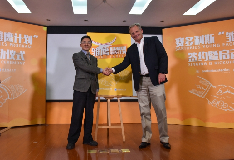 接下来Joerg Lindenblatt先生和陆兵书记分别致辞,共同提出了雏鹰培养计划的愿景。随后Joerg Lindenblatt和陆兵分别代表双方签署了雏鹰培养计划协议书。紧接着主持人对雏鹰计划的具体内容进行了详细的介绍。最后,华东理工大学校友、赛多利斯销售总监王逢以及产品应用支持经理任雪芸,从自身经历出发,向同学们分享了职场心得体会并回答大家的提问。