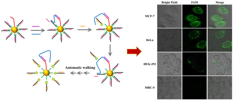 图片说明:DNA纳米机器的工作原理示意图和细胞内特异性miRNA激光共焦显微镜图像
