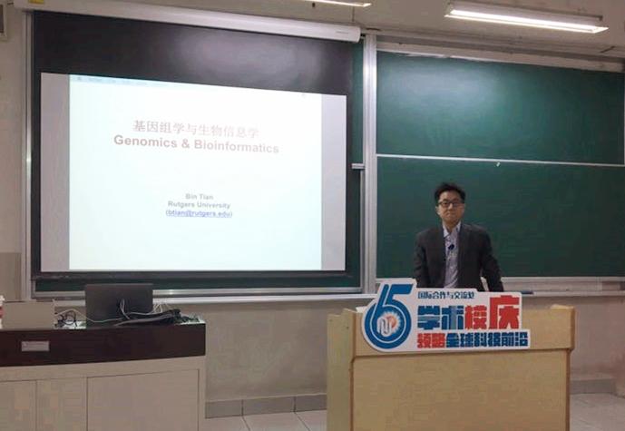杰出校友、罗格斯大学田斌教授应我院应用生物学系邀请,回母校进行交流与授课。在陆兵书记陪同下,田斌教授参观了生物反应器工程国家重点实验室,并为我院近些年取得的巨大成就而感到欣喜。随后,田斌教授给我院研究生进行了“基因组学与生物信息学”的课程教学,为同学们展示了基因组学研究中生物信息学技术的应用,同时介绍了RNA加工中最新研究热点,课程极大地开阔了同学们的视野,课内田斌教授与同学们就学术问题也展开了热烈的讨论,同学们纷纷表示受益颇多。期间,田斌教授在吴海珍教授、范立强副教授的陪同下参观了奉贤新校区,见证着母校的蓬勃发展,田斌教授谈到每次回母校都为母校的发展而自豪,表示希望能通过努力搭建华理与罗格斯大学学生联合培养及学术交流的平台,为母校的发展添砖加瓦,也祝愿母校越来越好。