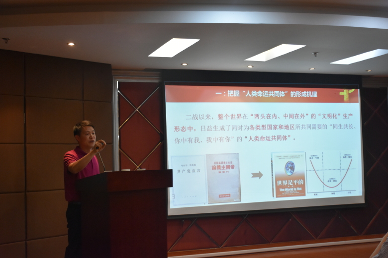 组织教工政治理论学习报告会,邀请马克思主义学院邱卫东副教授作了题为“在新时代推进构建人类命运共同体”的专题辅导报告。报告会由学院党委书记陆兵主持。