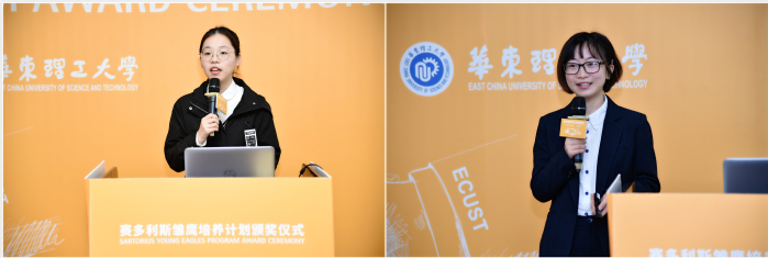 获奖者顾晓冰和徐佳依次分享她们参与雏鹰计划的心得体会。顾晓冰表示在雏鹰计划中,特别是企业轮岗制实习环节,学到很多,对职业规划认识更深刻,鼓励其他同学一定要把握机会,成就自我,实现梦想。徐佳表示,参加雏鹰计划是一段发现自我和成就自我的过程,使她认识到自己比想象中更优秀。这段经历使她明确了自己适合什么工作,明确了未来发展的方向,同时自身能力得到提升,收获了成长成才的快乐。