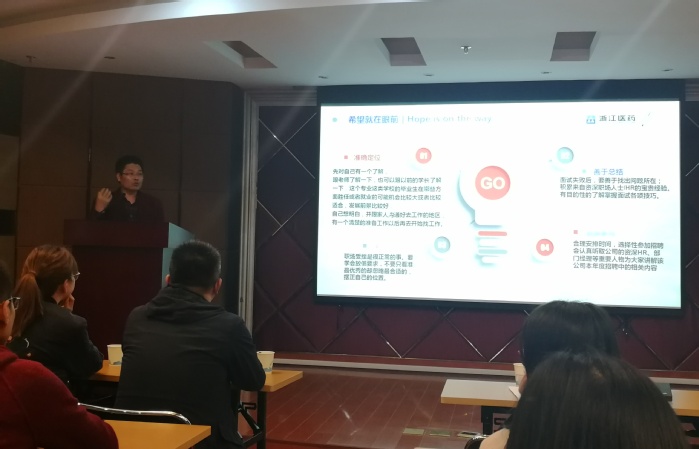 本次活动首先邀请了上海透景生命科技股份有限公司应用工程部总监张晓锋从“我是怎么面试”的角度,为准研究生们分享了在面试过程中需要注意的事项。随后,上海透景生命科技股份有限公司人事部容妍洁总经理以“求职经验分享”为题,从简历书写到面试细节问题等方面为大家做了相关经验分享。最后,浙江医药股份有限公司招聘主任唐仁喜总经理以“职步向前·相约在浙”为题,从秋招和春招的重要性、简历制作技巧和如何应对面试等方面,从企业角度为学生提供了求职参考。活动由人妻