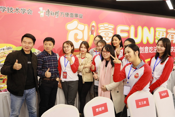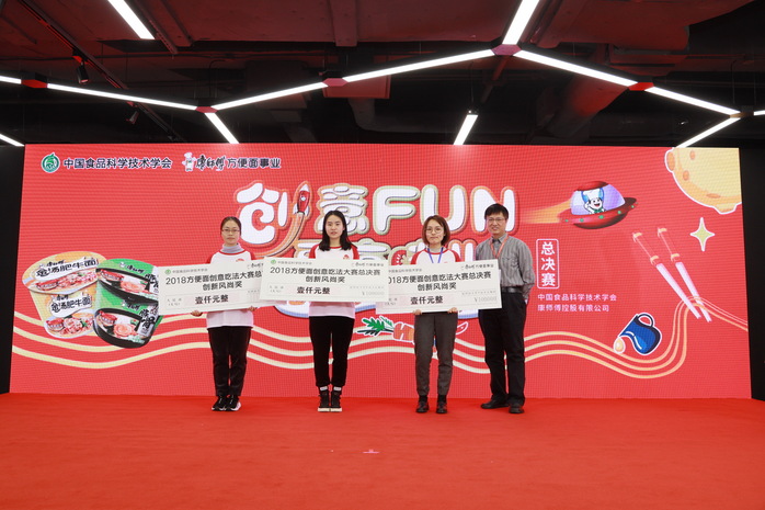 参赛选手沈瑜、连昱涵、潘小旭、刘昱妏的作品“小仙女VS隔壁老王”荣获产品创意奖,吴安迪、王明达、陈怡君、陆丹琳的作品“干!面”荣获创新风尚奖。康师傅集团上海地区董事长杨乾辉先生、康师傅集团副总裁王世琦先生及中国食品科学技术学会副理事长金征宇、中国食品科学技术学会名誉副理事长潘迎捷教授等出席大赛并给获奖选手颁奖。