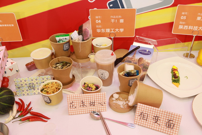 沈瑜团队针对干拌面倒水不便的问题设计了一款带有软塞的嵌套式双层面碗,还利用温变油墨对面盖纸作了改进,又在传统方便面的基础上制作了紫薯和菠菜非油炸面饼;吴安迪团队针对营养搭配、汤汁处理及面饼改良等方面进行了创意设计。这两组作品在决赛现场都引发了评委们的极大兴趣,也受到一致好评。