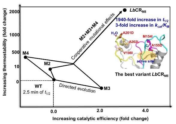 研究人员利用突变作用的加和性和协同性同时提高了羰基还原酶LbCR的热稳定性和催化活性。最优突变体LbCRM8在40°C下的热稳定性是母本的1944倍,催化效率kcat/KM是母本的3.2倍。值得注意的是,酶分子改造中经常会遇到稳定性与活性对冲的现象,因此上述热稳定性和活性的同时提升属于非常难得的结果。晶体结构测定表明,突变残基主要位于靠近活性中心的灵活loop环上,热稳定性提高的突变体中引入了新的氢键,并提高了蛋白内部的疏水作用力,从而增强了活性口袋周围灵活loop环的刚性。分子对接结果表明,活性提高的突变点虽然与底物没有直接接触,却导致酶和底物之间氢键作用的增加,从而提高了酶对底物的亲和性,稳定了蛋白与底物结合的作用力。此外,热稳定性提高的突变和活性提高的突变位于两个独立的区域(>10Å),突变作用的加和性为热稳定性和活性的同时提高提供了可能。最后,使用共表达最优突变体LbCRM8和BmGDH基因的大肠杆菌细胞作为催化剂,可以在40°C下不对称还原ATS-6生成ATS-7,最终反应成功放大到100 mL,时空产率达到1050 g L−1 d−1,底物/催化剂比率(S/C)达300 g/g。该研究成功实现了阿托伐他汀前体6-氰基-3R,5R-二羟基己酸叔丁酯的规模生物制备。
