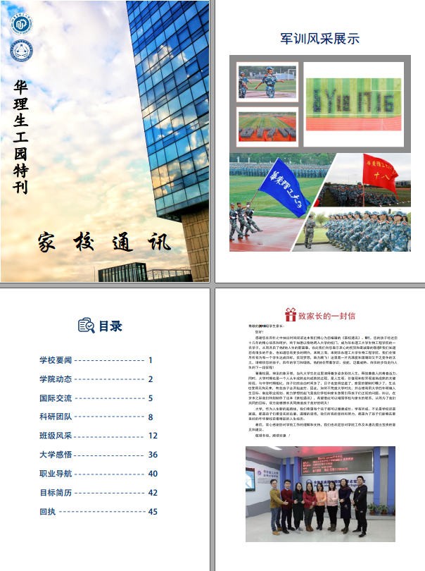 为帮助新生留住入校时那段宝贵的记忆,让远在异乡的家长深入、直观地感受到孩子的成长进步,我院通过制作“家校通讯”这本刊物,在沟通与分享中让家校关系变得更加亲近。《家校通讯》聚焦学生成长经历,由学校要闻、学院动态、国际交流、科研团队、班级风采、大学感悟、职业导航、目标简历以及师长寄语等多个板块组成,而这本刊物也得到了众多家长的认可,接近100%的家长给予了热情的反馈。