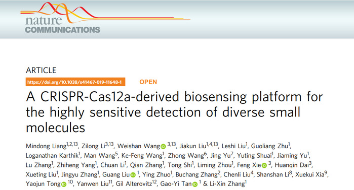 2, Liang et al, A CRISPR-Cas12a-derived biosensing platform for the highly sensitive detection of diverse small molecules. Nature Communications, 2019, 10:3672.