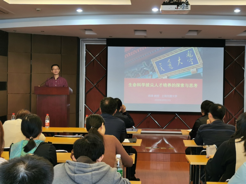 20191022日下午,学院邀请国家生物工程及生物技术专业教指委秘书长、上海交通大学教务处副处长陈峰教授来学院做有关国家一流本科专业建设和人才培养的报告,报告题目为“生命科学拔尖人才培养的探索与思考”。学院院长庄英萍教授,教学副院长王启要教授,各系主任,教学骨干教师,青年教师培训基地班教师参加会议,王启要副院长主持会议。