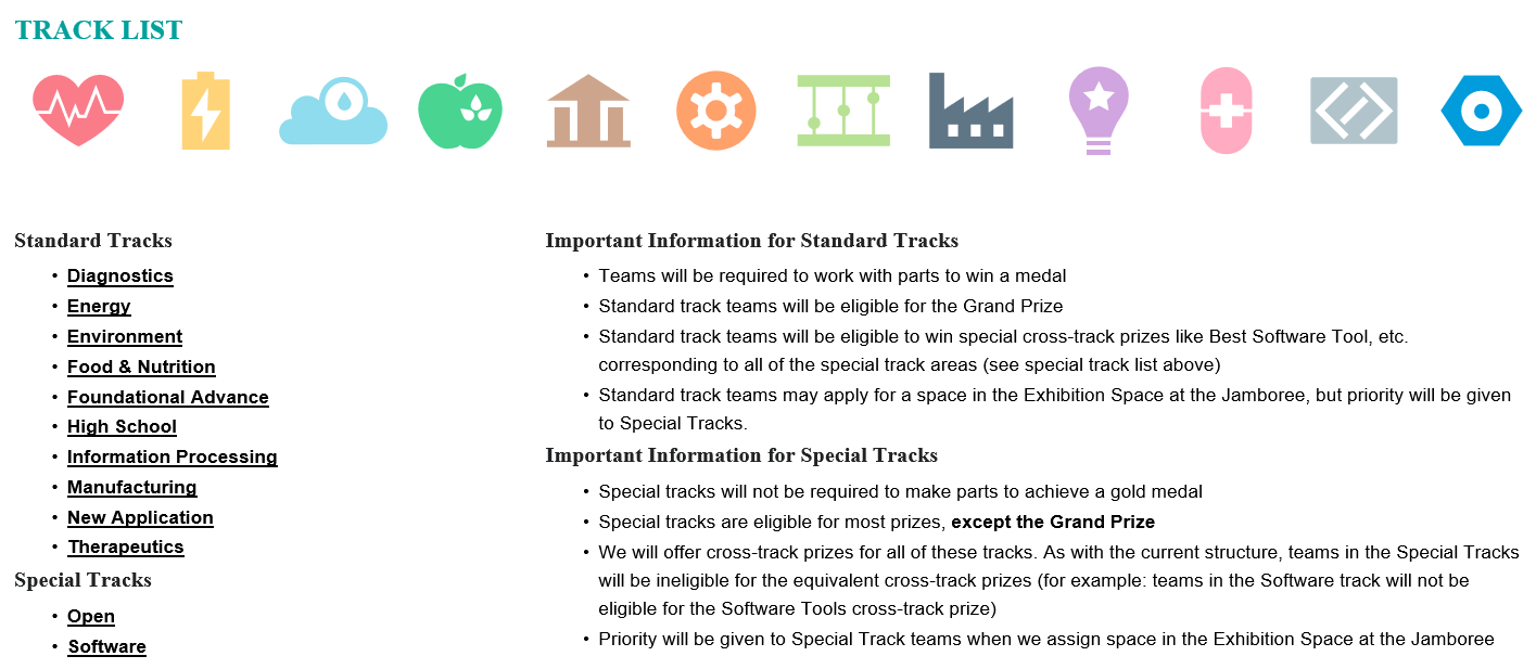 创意方向请参照2019iGEM官方track list(除了面向高中的High School组),与华理生物工程学科特色具有一定的契合度。