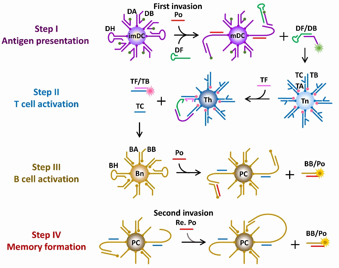 华东理工大学生物反应器工程国家重点实验室叶邦策教授课题组通过模块化设计DNA分子机器,开发了一种多DNA机器交互网络系统,成功模拟了脊椎动物获得性免疫系统中细胞与细胞间通讯对病原体的识别,清除以及记忆。通过三种DNA分子机器分别模拟关键免疫细胞:树突状细胞(DC)、T细胞和B细胞,生动地展示了病原体侵袭过程中DC细胞,T淋巴细胞和B淋巴细胞的连续激活、抗体分泌、记忆形成和快速高效的二次应答。