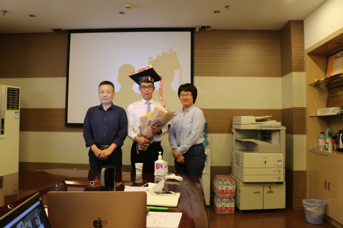 由于答辩委员不能来到现场,缺少了合影环节,张惠展课题组在答辩结束后向各位答辩评委直播了一个简短的仪式——两位导师为唐琼卫戴上自制的“博士帽”、送上献花以示祝贺,并合影留念;唐琼卫也在镜头前与大家分享了答辩感言和博士帽上记录的点滴华理生活,为紧张严肃的博士答辩添上轻松喜悦的一笔。
