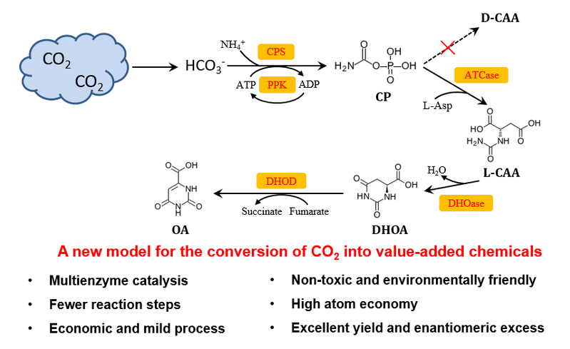 生物反应器工程国家重点实验室李志敏教授课题组应用多酶组合催化体系,在无细胞生物合成方向取得最新进展。有关成果分别在Green Chemistry以“Towards the conversion of CO2 into optically pure n-carbamoyl-l-aspartate and orotate by an in vitro multienzyme cascade” (// doi.org/10.1039/D0GC02268C) 和Journal of Agricultural and Food Chemistry以“Efficient one-pot synthesis of cytidine 5’-monophosphate using an extremophilic enzyme cascade system” (//doi.org/10.1021/acs.jafc.0c04055)为题进行了报道。