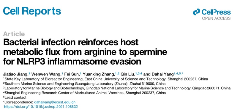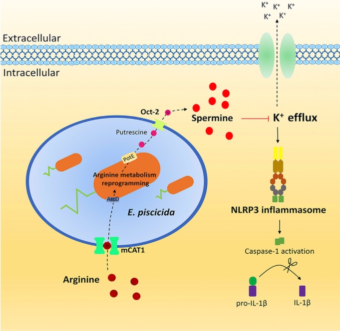 刘琴教授课题组关于水产养殖关键病原细菌Edwardsiella piscicida与巨噬细胞互作的分子机制研究,阐明了细菌通过精氨酸代谢通路,靶向利用宿主细胞质多胺池,实现巨噬细胞NLRP3炎症小体逃逸的现象。