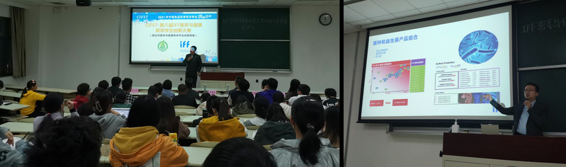 赵黎明代表中国食品科学技术学会向师生介绍了中国食品科学技术学会的相关信息、“两岸学生创新大赛”的历史以及往届赛事的概况。之后,他详细介绍了此次创新大赛的比赛性质、比赛时间节点、团队构成、产品创意计划书的撰写等,并鼓励同学们积极参与,开阔思路,敢于尝试,用心准备。IFF乳品应用专家李晴辉从IFF的发展历程、业务范围以及IFF在此次大赛中为参赛学生提供的配料、方案实施帮助等方面做了详尽的介绍。