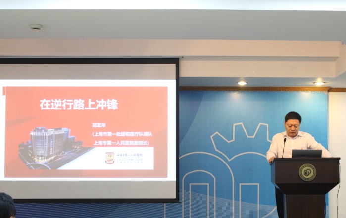 郑军华教授从组织的威力、斗争的本领、牺牲的精神、信念的力量四个方面,用朴素的语言生动详细讲述了面对突如其来的疫情,在2020年除夕之夜临危受命,带领上海市第一批援鄂医疗队在3个小时内紧急集合,驰援武汉,67天抢命金银潭,最终取得胜利的经历,用一件件具体事例和一位位人物事迹生动诠释了“生命至上、举国同心、舍生忘死、尊重科学、命运与共”的伟大抗疫精神。