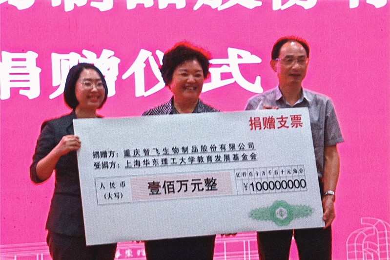奉贤校区通海厅举行。校党委常委、副校长李涛,智飞生物党委副书记、副总裁谢莉等出席活动,捐赠仪式由人妻