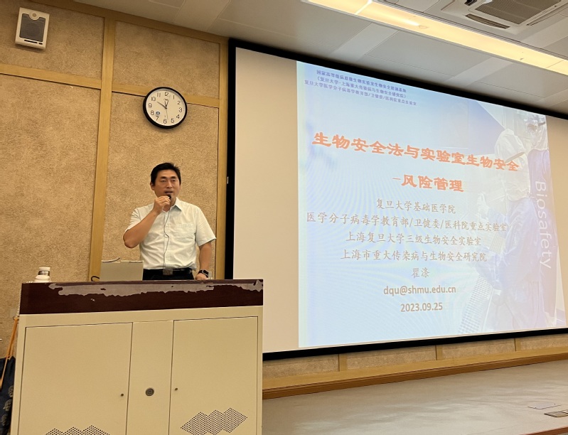 2023级研究生新生实验室生物安全培训讲座在徐汇校区举行。本次讲座邀请了复旦大学三级生物安全实验室主任瞿涤教授为同学们进行培训,学院党委副书记左鹏主持,学院安全员、辅导员、全体研究生新生参加了本次培训讲座。