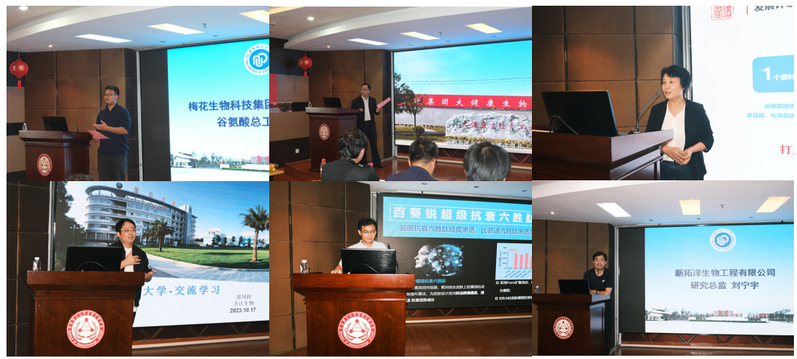 六位到场嘉宾分别为梅花生物科技集团股份有限公司谷氨酸总工杨俊生、玉星生物(集团)股份有限公司总经理杨军林、山东润德生物科技有限公司研发总监李贵伶、新拓洋生物工程有限公司研究总监刘宁宇、百葵锐(深圳)生物科技有限公司的厂长罗石柱和浙江圣达生物药业股份有限公司的研究院副院长郭凤柱。嘉宾们结合企业特色和个人经历,生动细致地介绍了行业前景、就业形势、工作感悟,对同学们的科研学习、职业规划提出建设性意见。