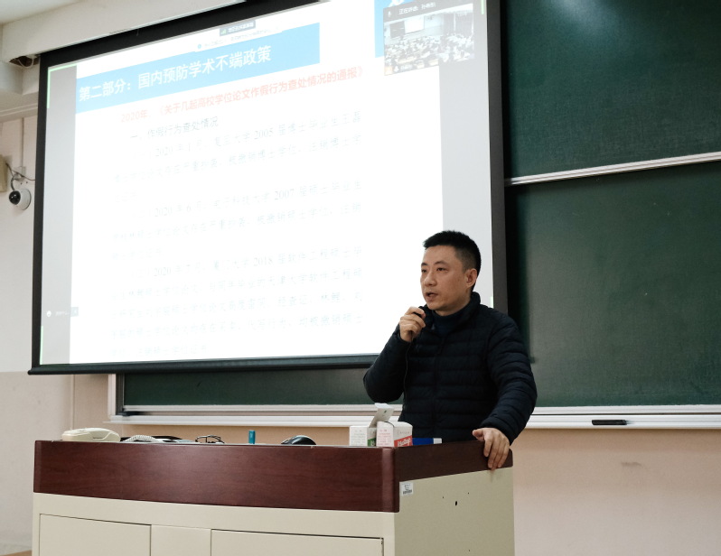会上,刘涛围绕学位论文的常见不端行为、相关预防学术不端行为的政策规定、申请学位各个环节的要点等方面展开讲述,并分析了国内外常见的学术不端的经典案例,向同学们明确了科研底线,加强同学们的学术规范意识,为毕业生规范撰写学位论文提供了保障。他希望,同学们能恪守科学道德与学术规范,不断开拓创新,向自己的研究生学段提交一份满意的答卷。