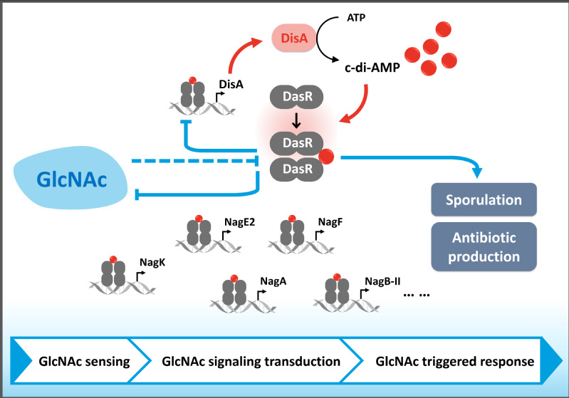 该研究发现了c-di-AMP能够调节GlcNAc信号转导的新功能,解析了c-di-AMP与转录因子DasR非共价结合调控放线菌发育与次级代谢的分子机制,揭示了除(p)ppGpp,c-di-GMP以外的又一种核苷酸类第二信使对于放线菌生理功能的调节模式,对于全面理解放线菌生理代谢与功能,提升放线菌在合成生物学、疾病治疗、药物和疫苗等生命健康领域应用提供了新的思路。