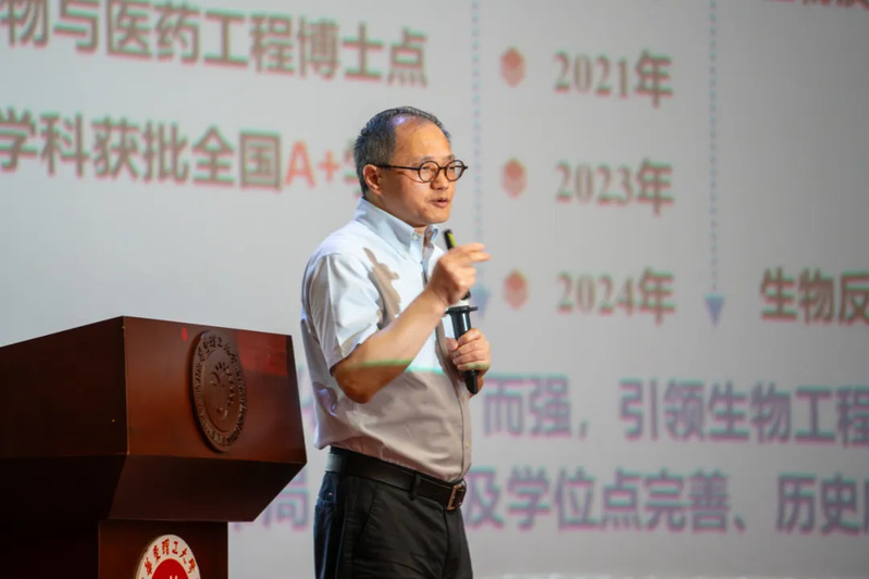 叶邦策详细介绍了学院及生物工程学科的发展历程与现状。他强调,学院拥有国内首个抗生素制造工学专业,已建立起本硕博博士后一体化全方位人才培养体系,为同学们提供了广阔的发展空间。他还与同学们探讨了大学的异化与回归,鼓励大家不仅要学习专业知识,还要培养人文素质,将所学知识融会贯通,构建自己的知识体系。