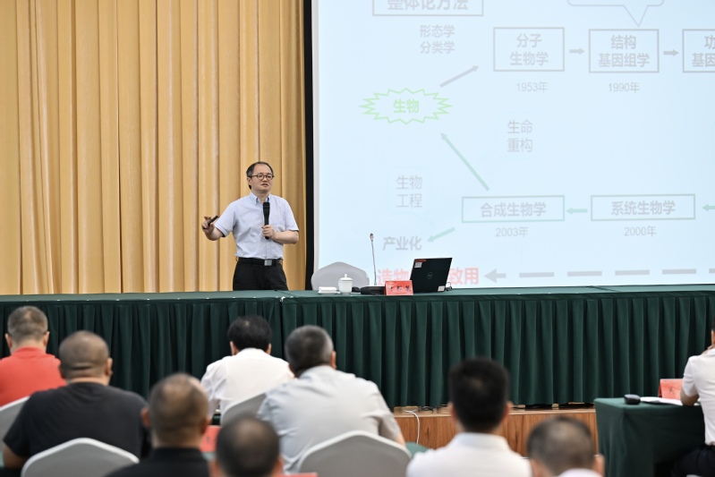 讲座上,叶邦策以“合成生物学创新发展与生物制造产业赋能”为题,系统阐释了合成生物学的内涵、发展态势和广阔应用前景,深刻揭示了其对生物制造产业乃至经济社会发展的革命赋能作用。他结合国家战略和区域发展实际,为遵义抢占生物经济新赛道、培育发展新动能提供了战略指导和应用思路。