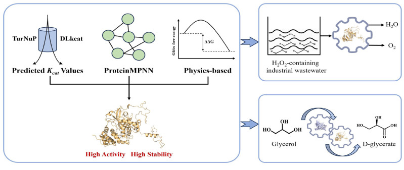 此外,团队针对模块I的限速步骤,引入计算辅助的酶工程策略,通过AlphaFold3结构预测、ProteinMPNN序列设计与能量打分筛选,从嗜热菌来源过氧化氢酶出发,获得了四突变体D78P/K201R/E384Y/T435A。该变体酶活提升1.9倍,Tm值提升8°C,半衰期提高5倍延长至145小时,打破了活性与稳定性之间的权衡限制,实现模块I甘油酸产率显著提升。此外,变体在医疗废水、纺织漂洗液、乳品加工液等体系中,表现出对H2O2显著优于商品酶的处理能力,反应时间缩短50%。该研究不仅为ncAAs绿色合成提供了优选元件,也为甘油高值利用和工业废水处理开辟了可持续发展的新路径。