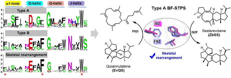 萜类化合物是天然药物宝库的重要组成部分,青蒿素、紫杉醇等明星药物均属于此类。真菌双功能二倍半萜合酶(BF-STPSs)能够通过协同催化异戊二烯链的延伸与环化,生成结构复杂且生物活性突出的二倍半萜类化合物。课题组前期研究系统揭示了G2 螺旋作为萜合酶的关键功能可塑区,基于分子动力学MD模拟指导进行蛋白质工程改造,实现了催化功能的精密转换并获得新颖萜类化合物(Angew. Chem, 2024, 63(37): e202406246; ACS Catalysis, 2025, 15: 12984)。然而,这类酶催化碳骨架重排反应的机制是领域中公认的难题。
