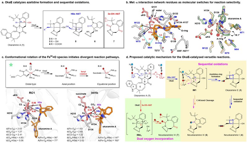 图片说明:a. OkaE催化氮杂环丁烷构建与多步连续氧化反应;b. Met–π相互作用网络中的关键残基作为调控反应选择性的分子开关;c. FeIV=O高价铁氧活性中间体构象旋转是OkaE多功能催化的关键起始步骤;d. OkaE 催化多功能反应的机制简要示意图