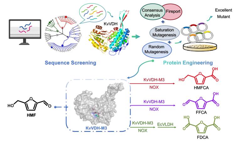 HMF的合成及其催化升级被认为是从化石经济向可持续经济过渡的关键。石油基向生物基聚合物的转型亟需替代用于生产PET的对苯二甲酸的可再生方案,其中FDCA作为PEF的直接替代单体尤为突出。本研究为了拓展呋喃羧酸的酶促合成途径,开发了“分子探针与功能介导的迭代基因组挖掘”策略,将功能酶发现率提升至 32.1%(传统同源筛选的3倍)。基于KnowVolution策略,结合计算设计和定向进化对双功能HMF氧化酶进行连续酶工程,获得了稳定性和催化性能协同提升的最佳变体M3,实现了将高浓度HMF高效、高选择性转化为HMFCA和FFCA。同时,基于酶工程的分子动力学和MM/PBSA 结合自由能计算探究了突变体催化性能提升的分子机制。最后,设计了一锅两步级联反应,实现了从高浓度HMF(90 mM)高效合成FDCA。这项研究探索了更广泛的酶催化剂,开发的生物催化工艺在高浓度HMF存在下展现出优异的选择性和呋喃羧酸收率,有助于推动呋喃羧酸在生物基化学品生产中的绿色应用。