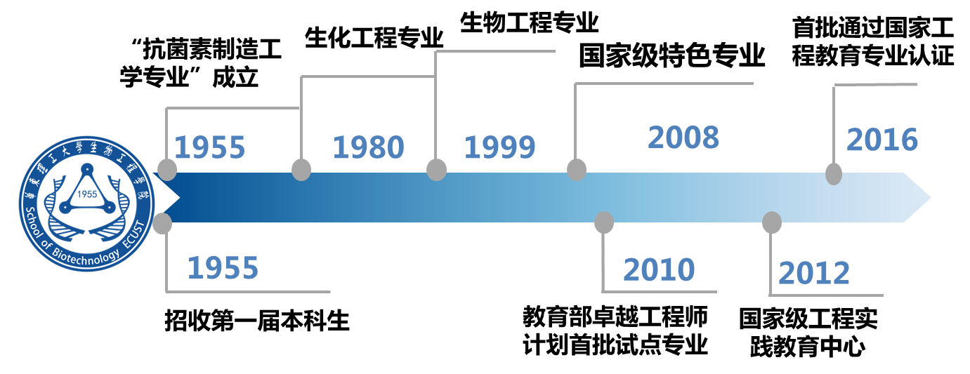 生物工程是利用生物学与工程学相结合的方法,按照人类的需要设计和改造生物的结构与功能,以便绿色、高效、经济地制造各种产品的新型学科,是生命科学从实验室研究通向工业生产的桥梁。华东理工大学生物工程专业是国家特色专业,其办学历史起源于1955年创建的“抗生素制造工学专业”,为我国化工、医药、食品等领域培养了一大批科学、工程和技术人员。随着学科的发展(如图),生物工程专业在基因工程、生物催化工程、药物开发、动植物细胞培养、发酵工程、生物产品分离纯化、生物制药工程等领域形成了科研教育相融合、理论与工程相结合的办学特色。2016年生物工程专业首批通过教育部国际工程教育标准认证(全国唯二),生物工程教育获得国际认可,显著提高学生的国际竞争力。